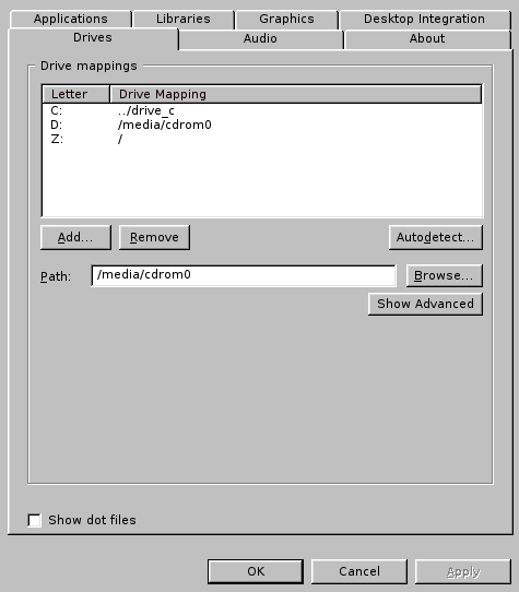 Drives tab in Wine